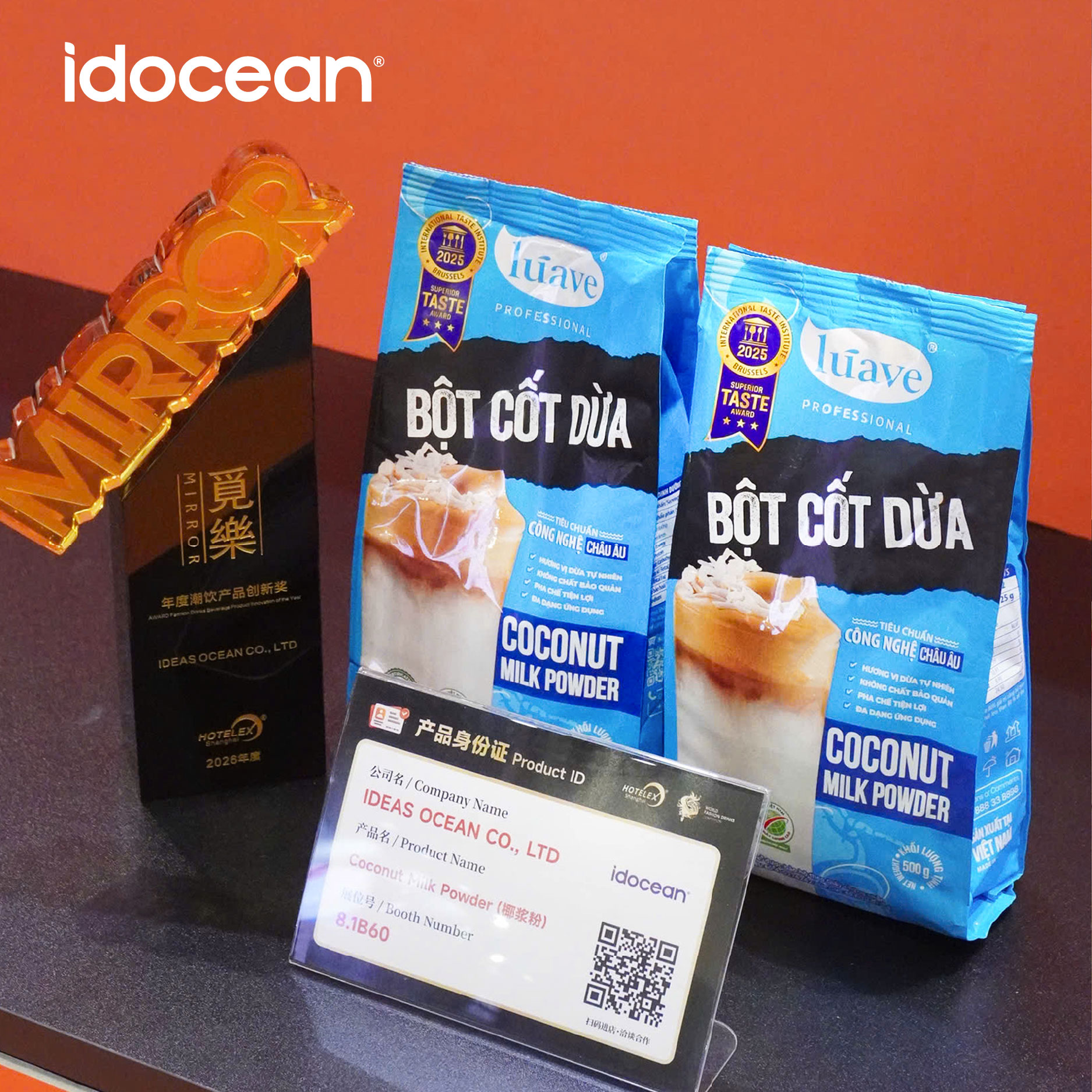 Tại HOTELEX SHANGHAI 2026, IDOCEAN – đại diện Việt Nam duy nhất tại khu vực Fashion Drinks Launch Lab, đã tạo dấu ấn khi sản phẩm Bột cốt dừa Lúave Professional được vinh danh với giải thưởng “𝙁𝙖𝙨𝙝𝙞𝙤𝙣 𝘿𝙧𝙞𝙣𝙠𝙨 𝘽𝙚𝙫𝙚𝙧𝙖𝙜𝙚 𝙋𝙧𝙤𝙙𝙪𝙘𝙩 𝙄𝙣𝙣𝙤𝙫𝙖𝙩𝙞𝙤𝙣 𝙤𝙛 𝙩𝙝𝙚 𝙔𝙚𝙖𝙧”.