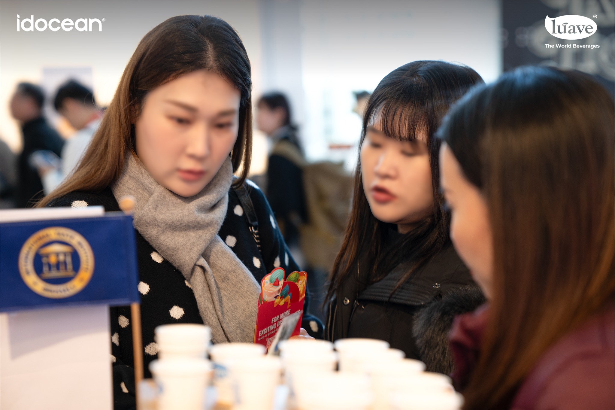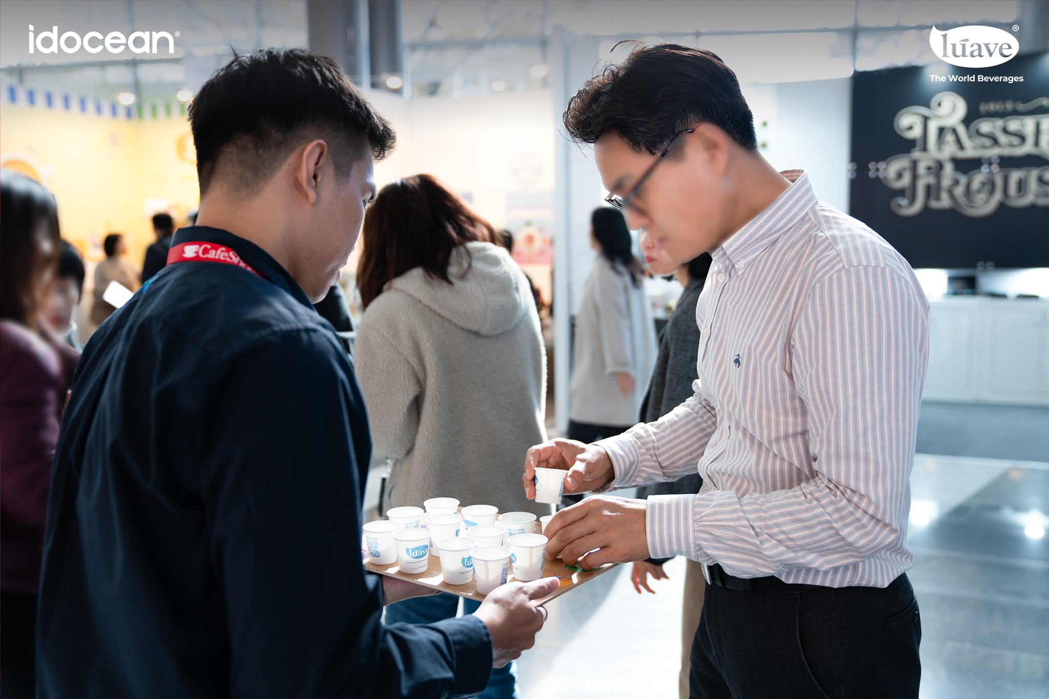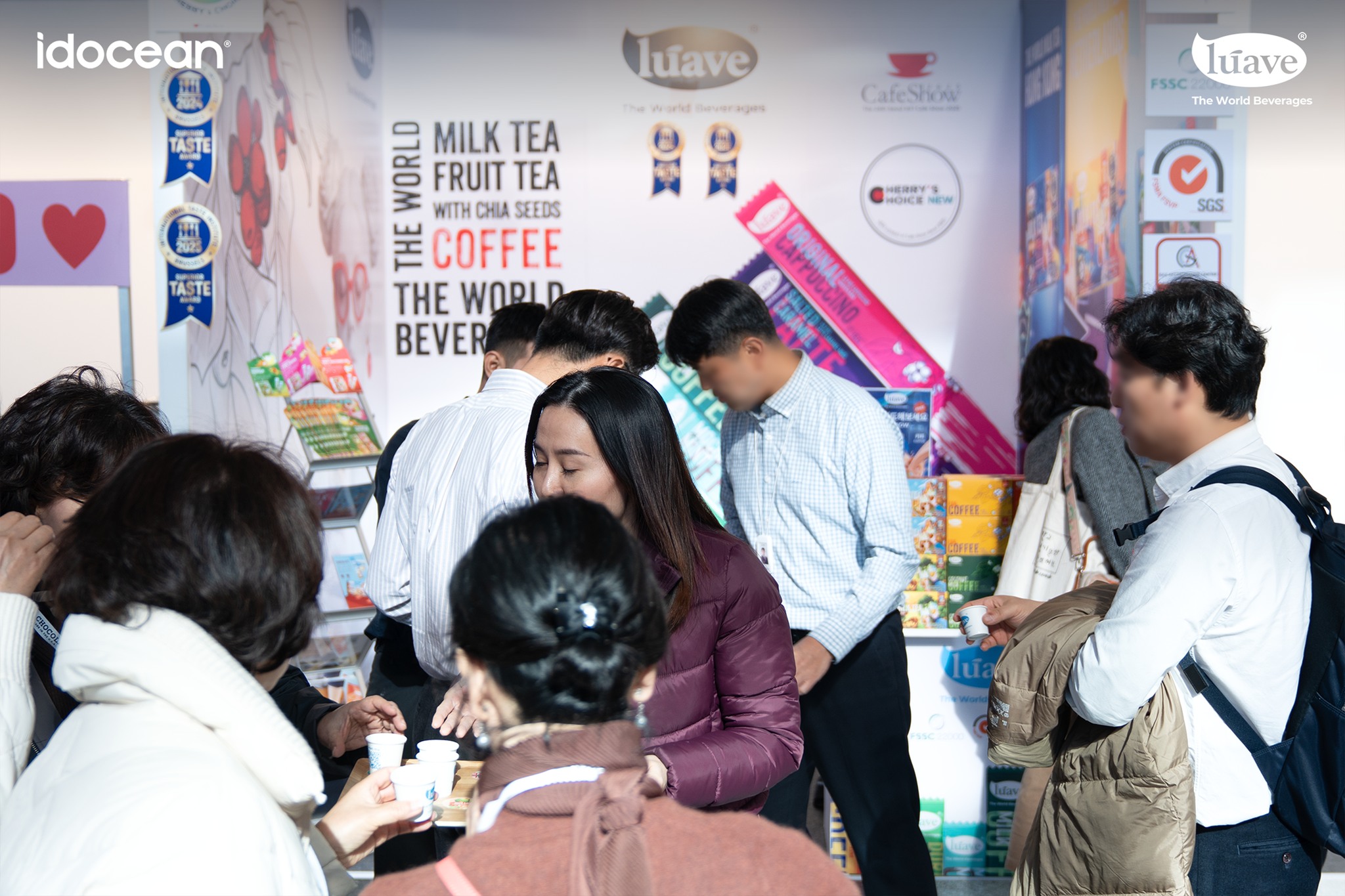 Tại gian hàng L121 (Hall B), các khách hàng Hàn Quốc và quốc tế vô cùng hào hứng khám phá các dòng sản phẩm thức uống nổi bật: Trà sữa, Trà trái cây, và đặc biệt là Cà phê Lúave – sự kết hợp hoàn hảo giữa cà phê Việt Nam, công nghệ hiện đại và chuẩn chất lượng quốc tế được sản xuất tại nhà máy IDOCEAN.